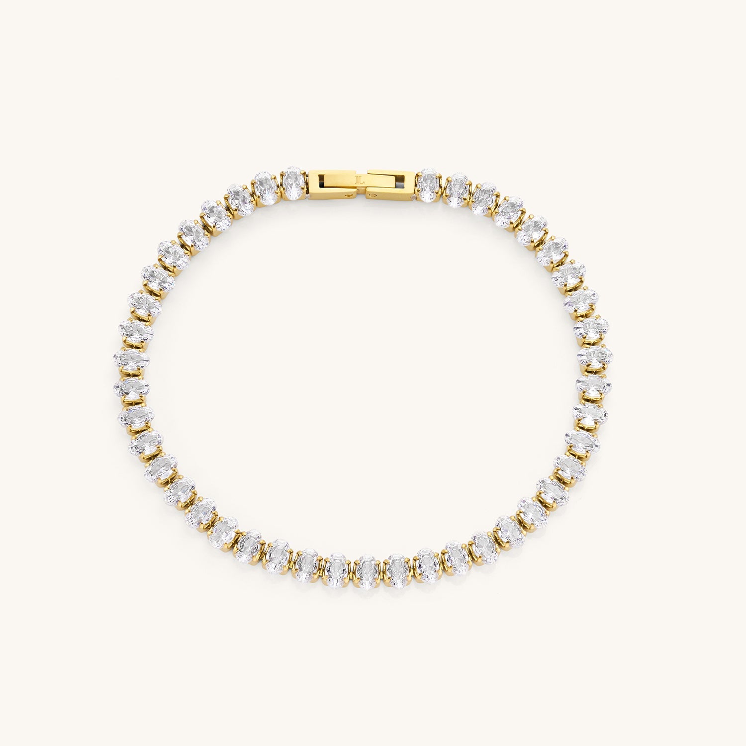 Details: Elevate your style with this exquisite oval-cut gold tennis bracelet. Crafted with dazzling oval-cut crystals, this piece radiates timeless elegance and charm.