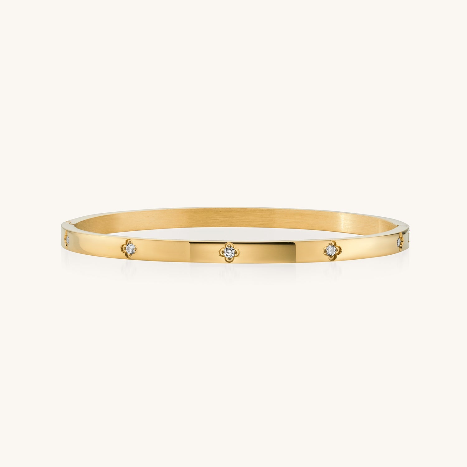Details: Elevate your wrist with the enchanting charm of this gold bangle featuring a mesmerising clover pattern adorned with sparkling crystals.
