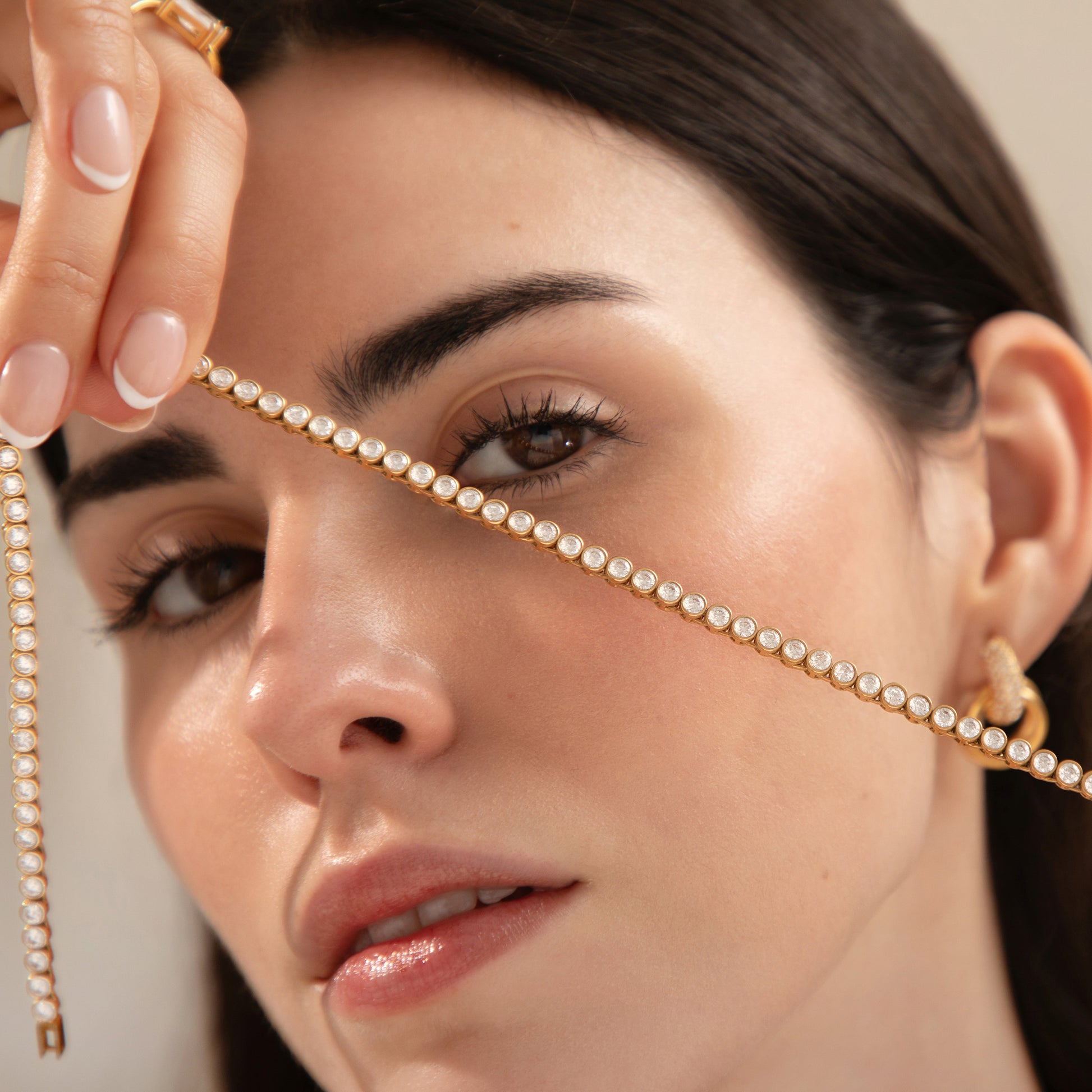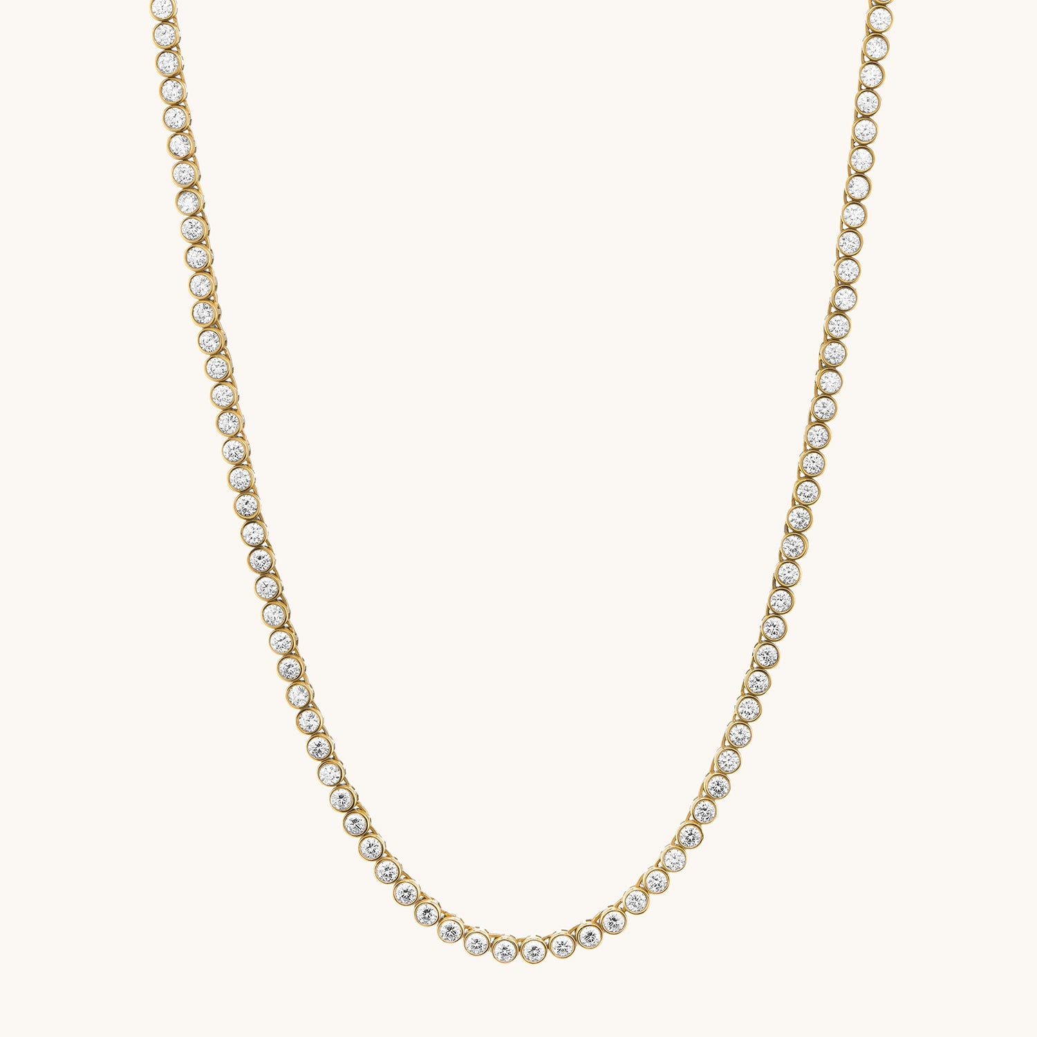 Details: The Sienna Tennis Necklace brings effortless shine. This statement chain is thoughtfully designed to lay flat and never flip, it hugs the neckline with a smooth, seamless finish that feels as good as it looks.